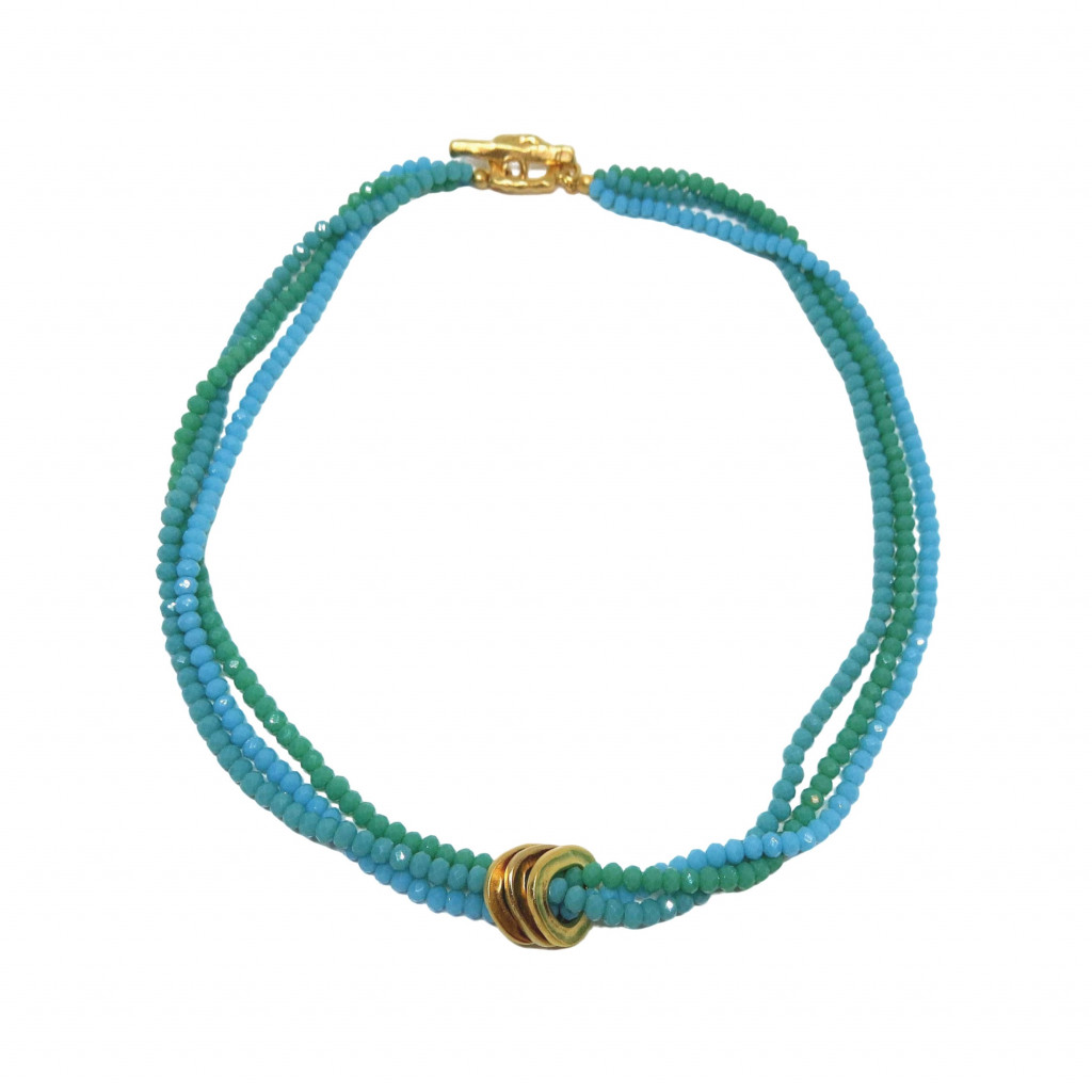 ❤ השרשרת מעוצבת משלוש שורות של קריסטלים נוצצים בגווני טורקיז בשילוב שלוש טבעות בציפוי זהב 24 קראט