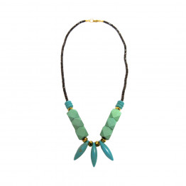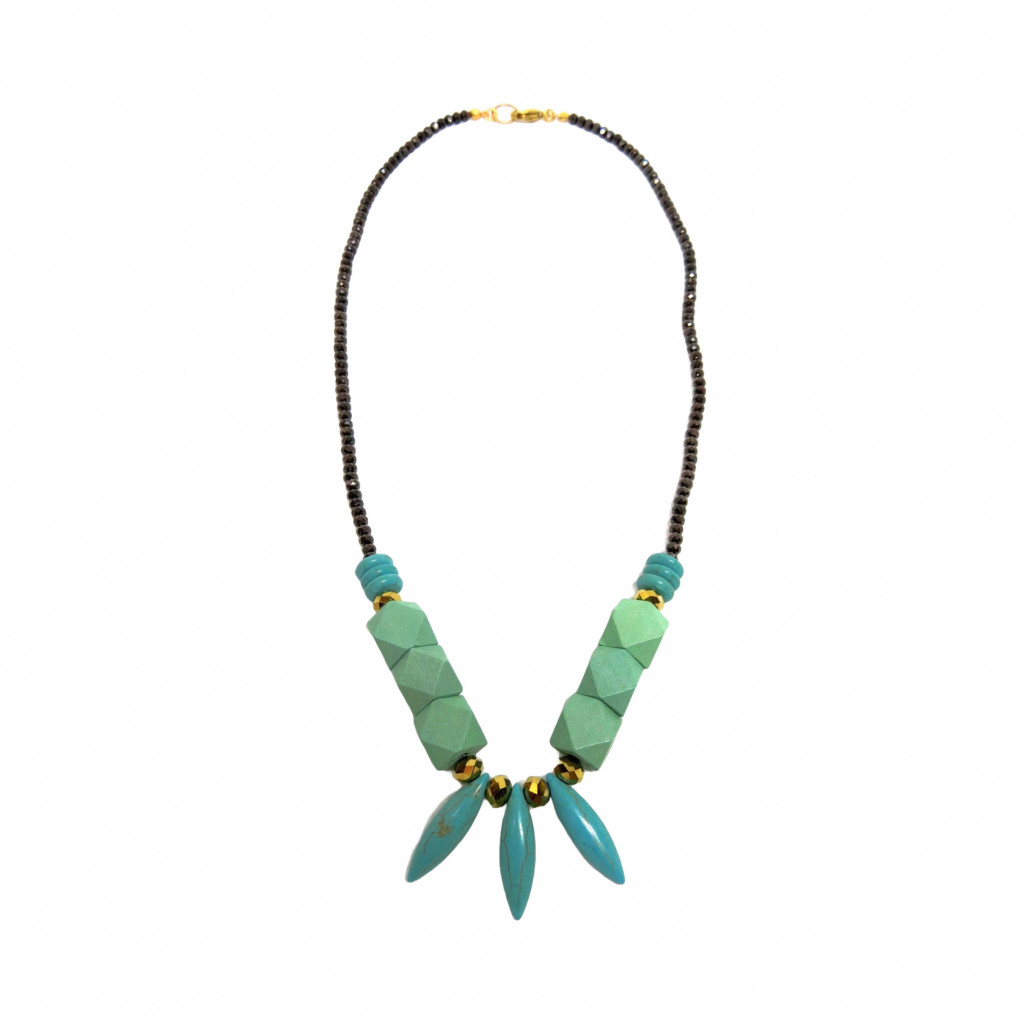 ❤ השרשרת מעוצבת משלושה תליוני אבני חן טורקיז בשילוב חרוזי עץ בגוון מנטה, קריסטלים חומים וטבעות אבני חן טורקיז וקריסטלים בגוון זהב