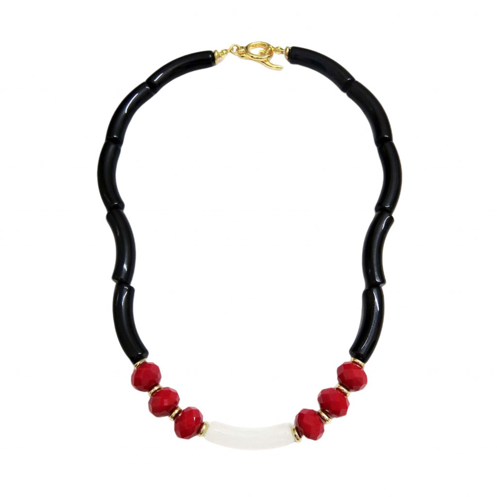 ❤ השרשרת מעוצבת מעשרה חרוזים מעוקלים מאקריליק שחור מבריק בשילוב קריסטלים בגוון בורדו, חרוזי זהב ואלמנט מעוקל מאקריליק לבן