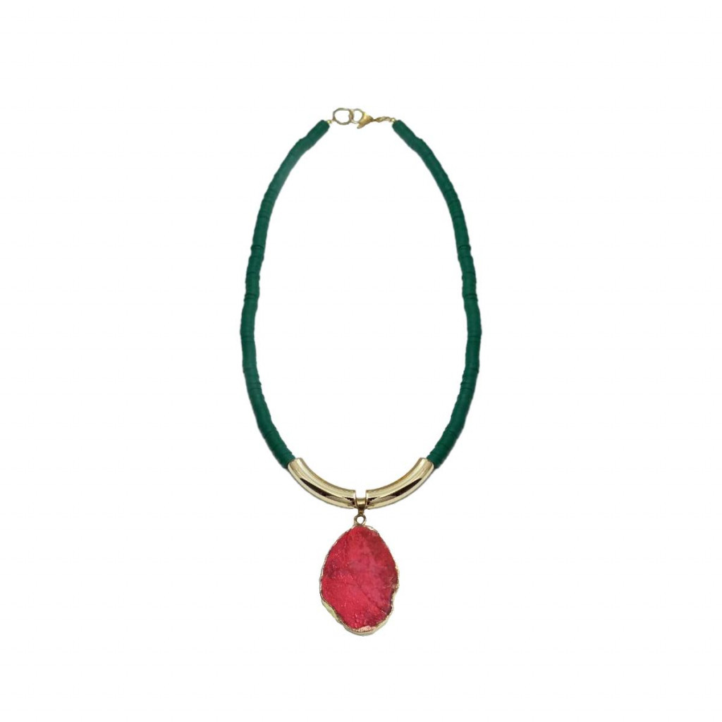 ❤ השרשרת מעוצבת מחרוזי טבעות פולימר בגוון ירוק כהה, צינורות מעוקלים אקריליק בגוון זהב בשילוב תליון אבן קוורץ טבעית בגווני אדום, ציפוי זהב 18 קראט מסביב לאבן